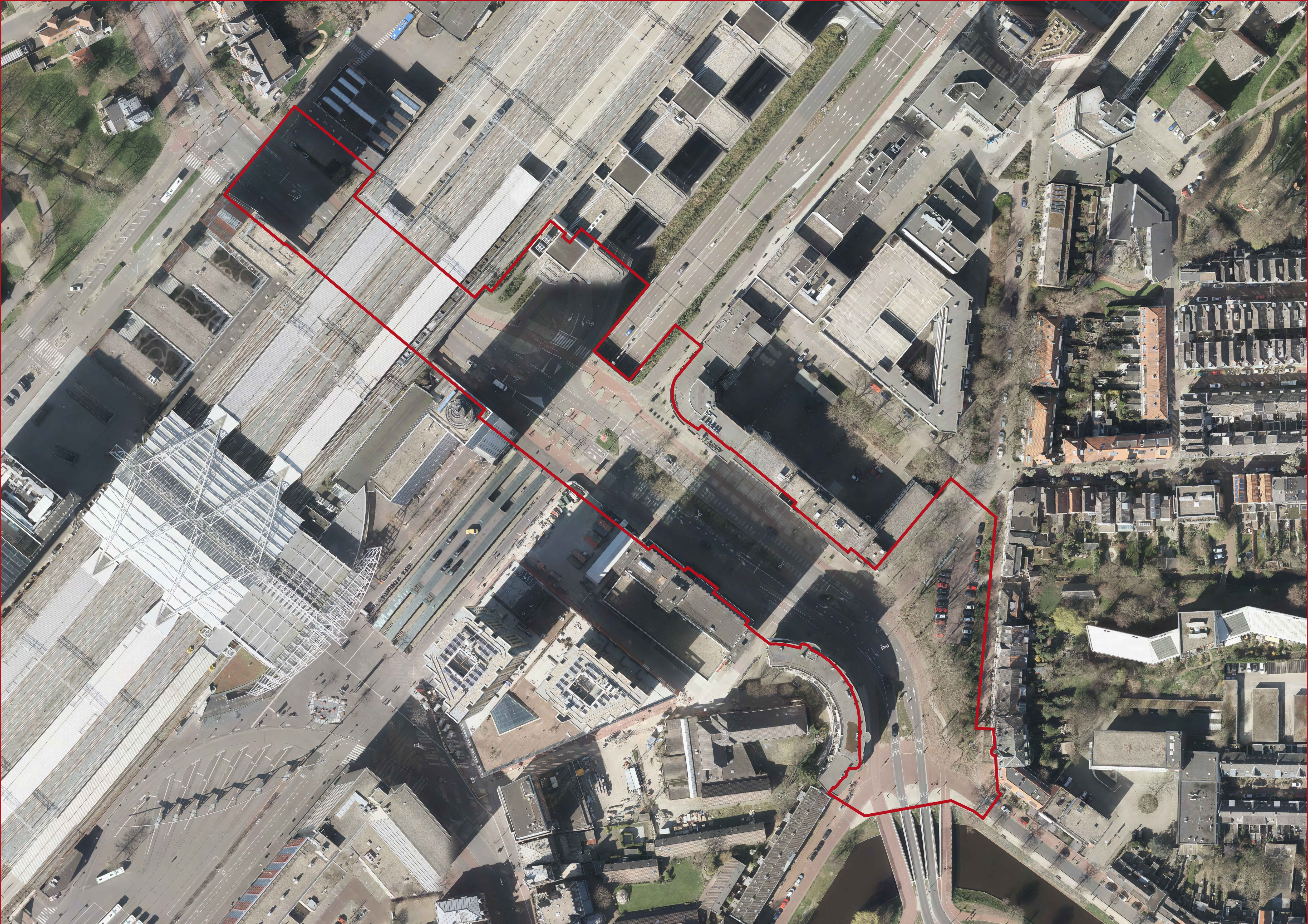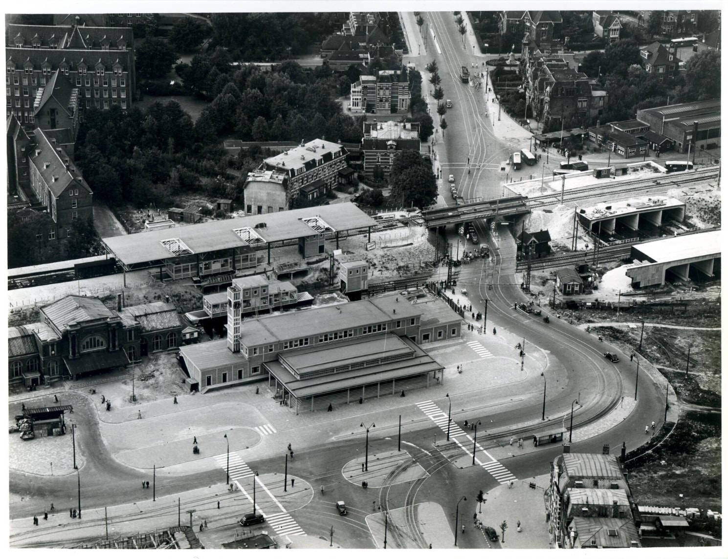 Stationsplein ca. 1950 met rechts in aanbouw zijnde het Rijnsburgerviaduct