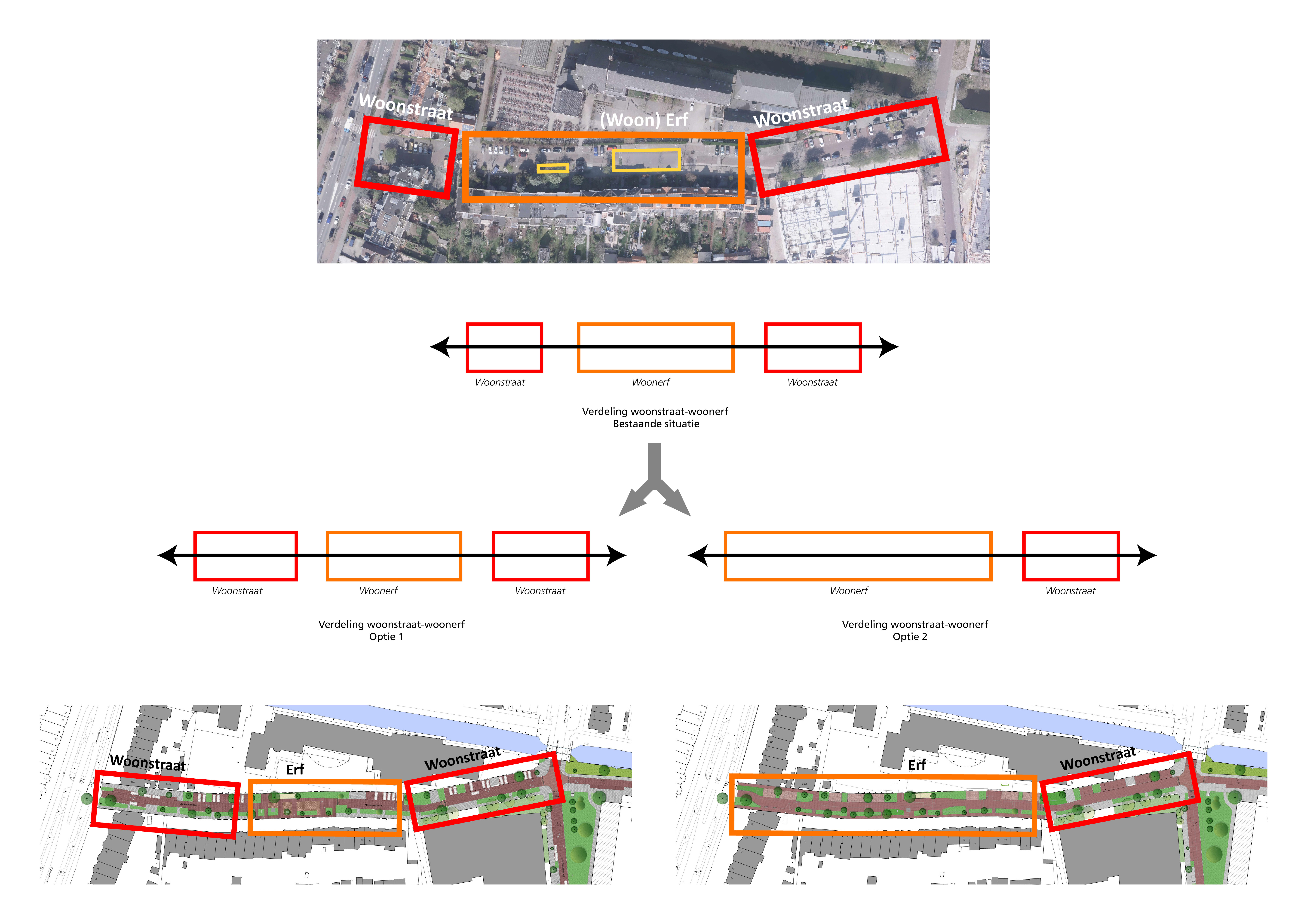 De twee varianten bestaan allebei uit een combinatie van woonstraat en woonerf. In variant 1 is het grootste deel van de straat ingericht als woonstraat, in variant 2 is het grootste deel woonerf.