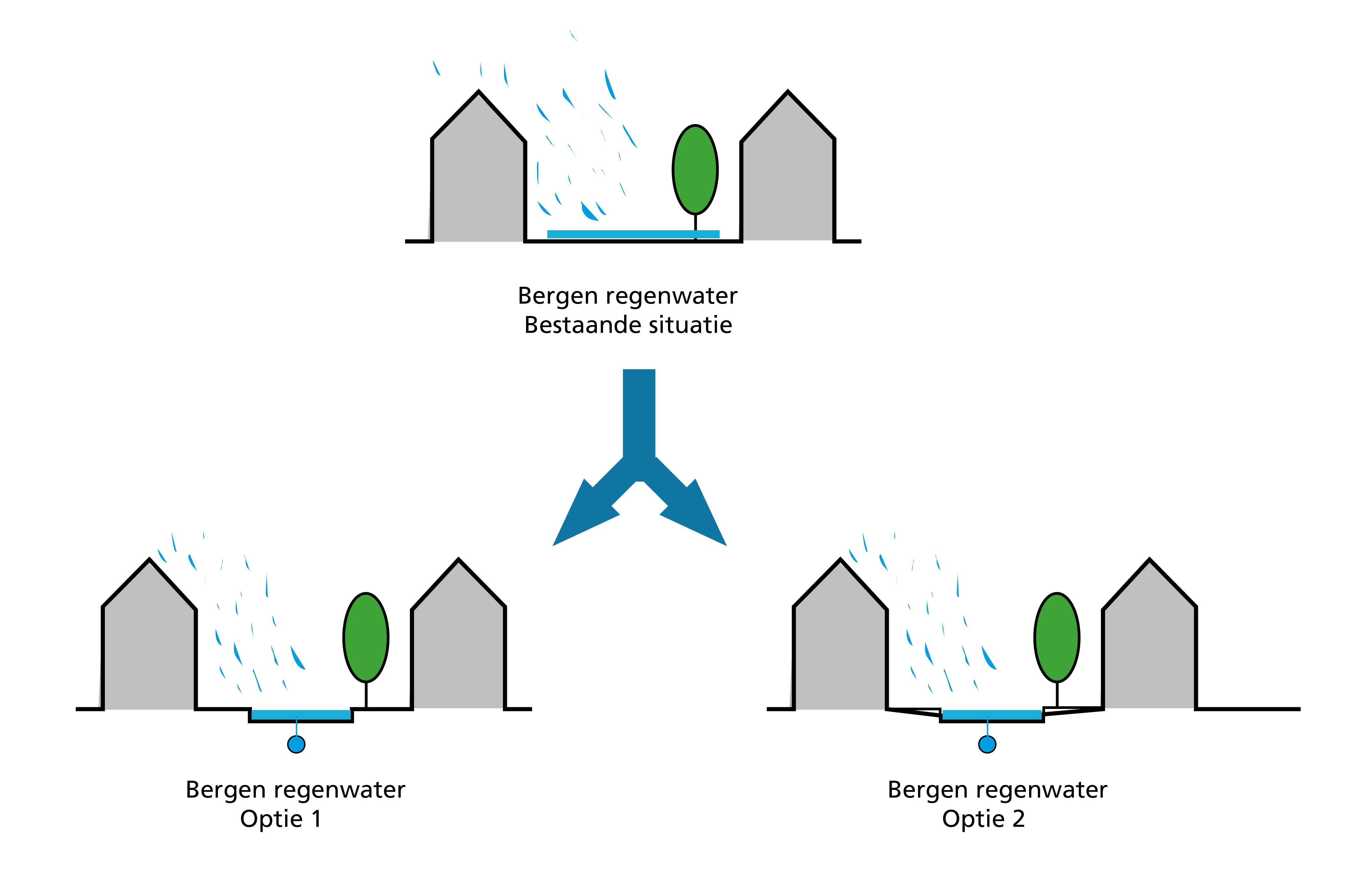 - Waterberging op straat: de rijbaan wordt in een groot deel van de straat verlaagd.