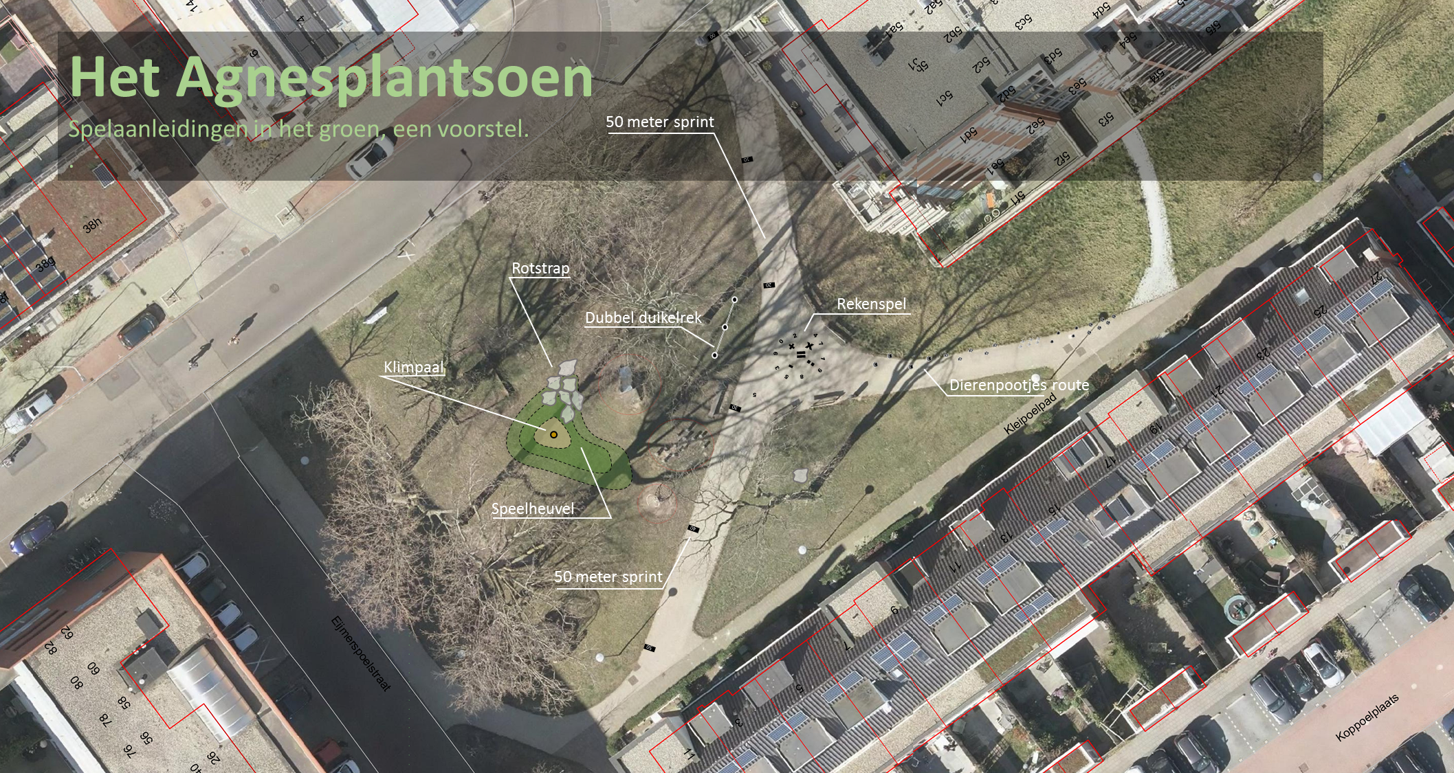Er is geen ruimte in de buurt voor de aanleg van een nieuwe speelplek. Daarom is gekozen om de speelmogelijkheden op het Agnesplantsoen te verbeteren.